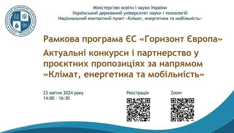 Національний контактний пункт за напрямом «Клімат, енергетика та мобільність» Українського державного університету науки і технологій запрошує взяти участь в Інформаційному дні «Рамкова програма Європейського Союзу з досліджень та інновацій «Горизонт Європа». Актуальні конкурси і партнерство у проєктних пропозиціях за напрямом «Клімат, енергетика та мобільність»