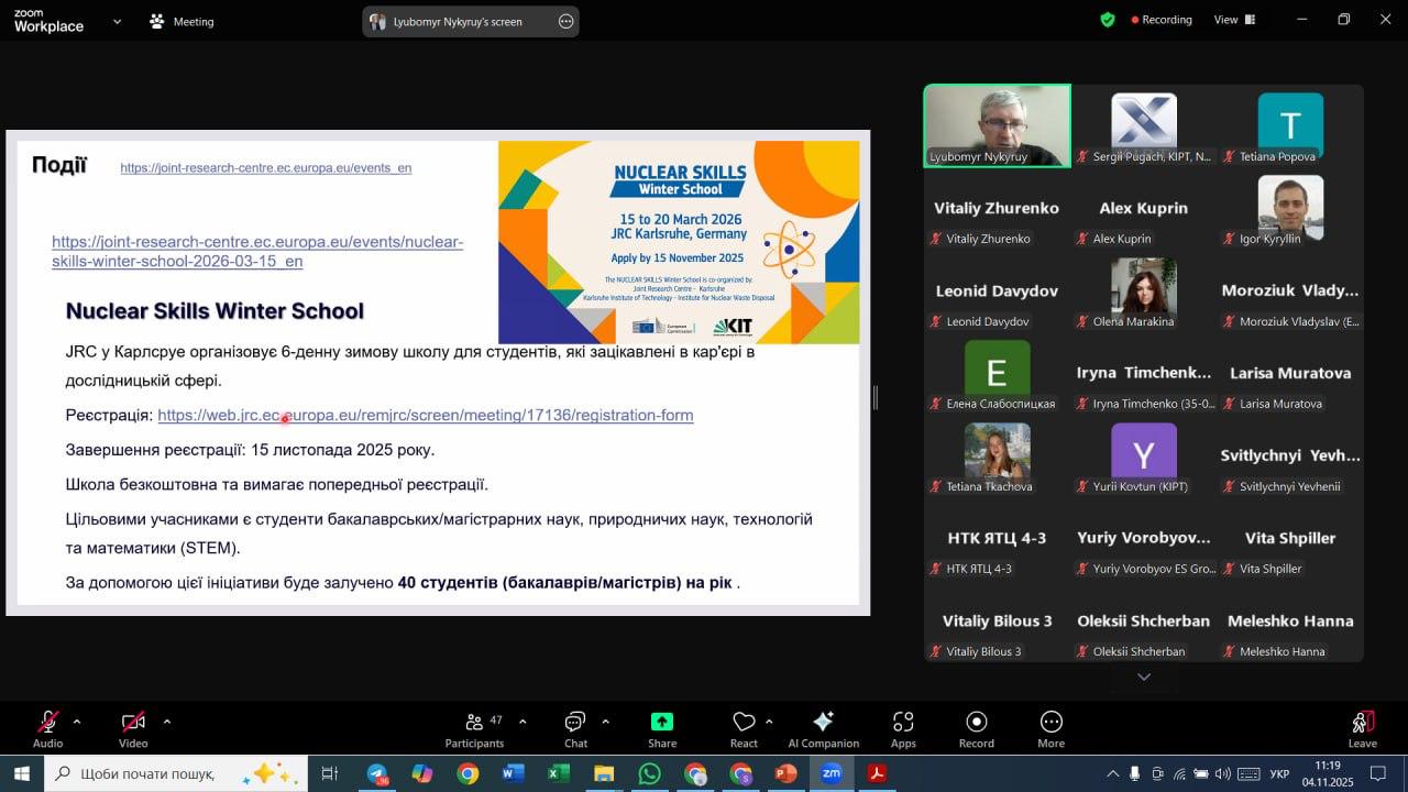 4 листопада 2025 року відбувся інформаційний день програми Горизонт Європа та Євроатом. До участі залучено кілька НКП України, які детально обговорювали із учасниками пропозиції для українських вчених щодо участі у Програмах. Зокрема, піднімалися питання: